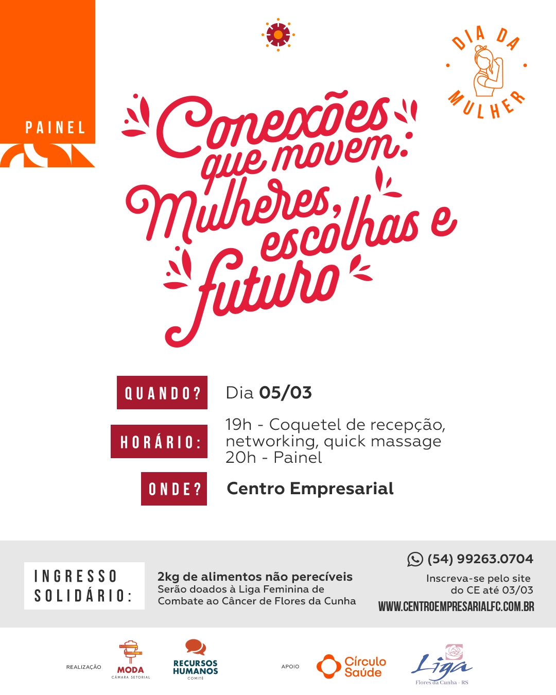 O Centro Empresarial realiza, no dia 5 de março, o painel “Conexões que movem: Mulheres, escolhas e futuro”, uma conversa aberta sobre trabalho, saúde, autocuidado e os desafios da maturidade feminina. O evento, alusivo ao Dia Internacional da Mulher, é uma realização das Câmaras Setoriais de Moda e do Comitê de Recursos Humanos do Centro Empresarial, com apoio do Círculo Saúde e da Liga Feminina de Combate ao Câncer de Flores da Cunha.
