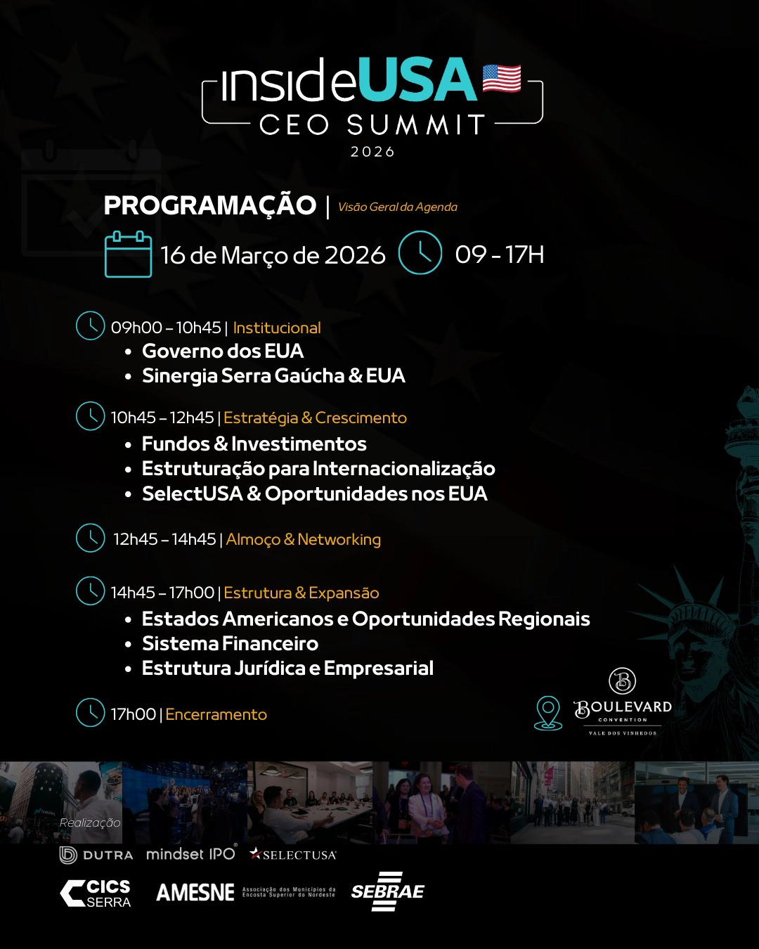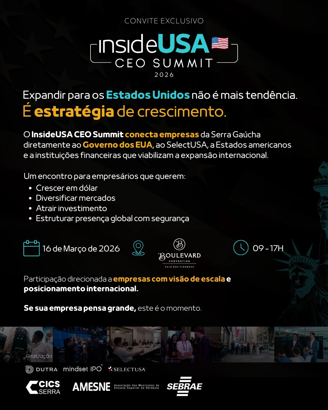 O InsideUSA CEO Summit 2026 será realizado no dia 16 de março, das 9h às 17h, no Boulevard Convention, em Garibaldi, reunindo empresários da Serra Gaúcha e de outras regiões do Sul do país. O encontro tem como objetivo aproximar empresas brasileiras de representantes ligados ao Governo dos Estados Unidos e apresentar caminhos para a internacionalização de negócios.